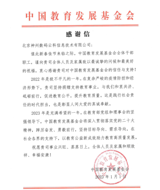 近期,evo视讯真人官网OB视讯集团收到中国教育开展基金会的感谢信,以感谢evo视讯真人官网OB视讯集团2022年在职业教育领域的贡献和实践,尤其是在全国职业院校大赛(中高职组)中对大赛顺利召开所付出的努力。